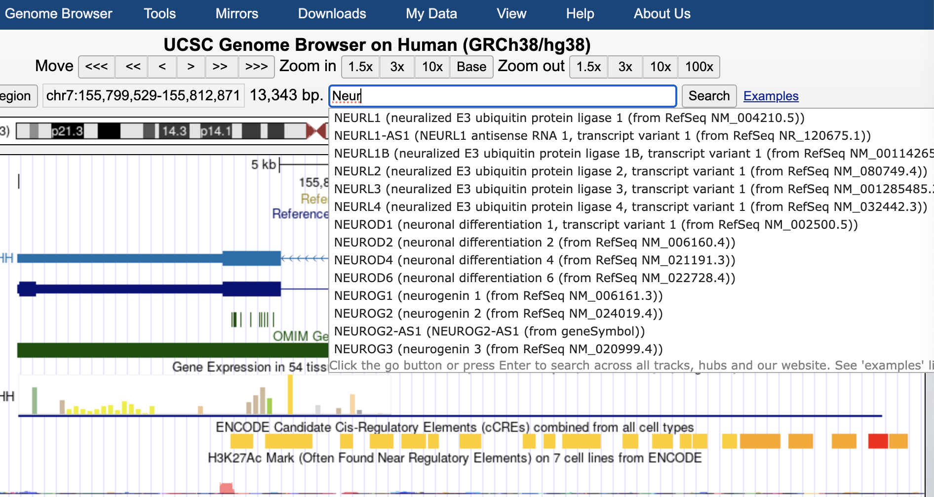 Please note, BLAT is used if your search term is a DNA sequence. For the best results, make sure your sequence is long enough to meet BLAT specifications. The examples link next to the search bar contains even more search queries.