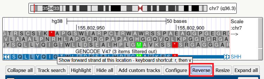To reverse the genome orientation, click the button, and the Genome Browser image will flip to show either the negative or positive strand.