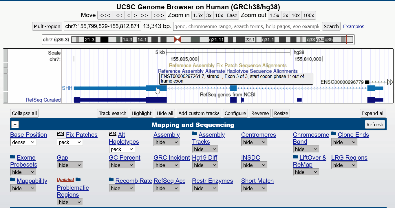 The search bar allows you to navigate to a region on the genome using genome coordinates, gene symbols, rsIDs, HGVS terms, or DNA sequence. You can even search documentation and FAQ pages using this search bar. A few example queries are: