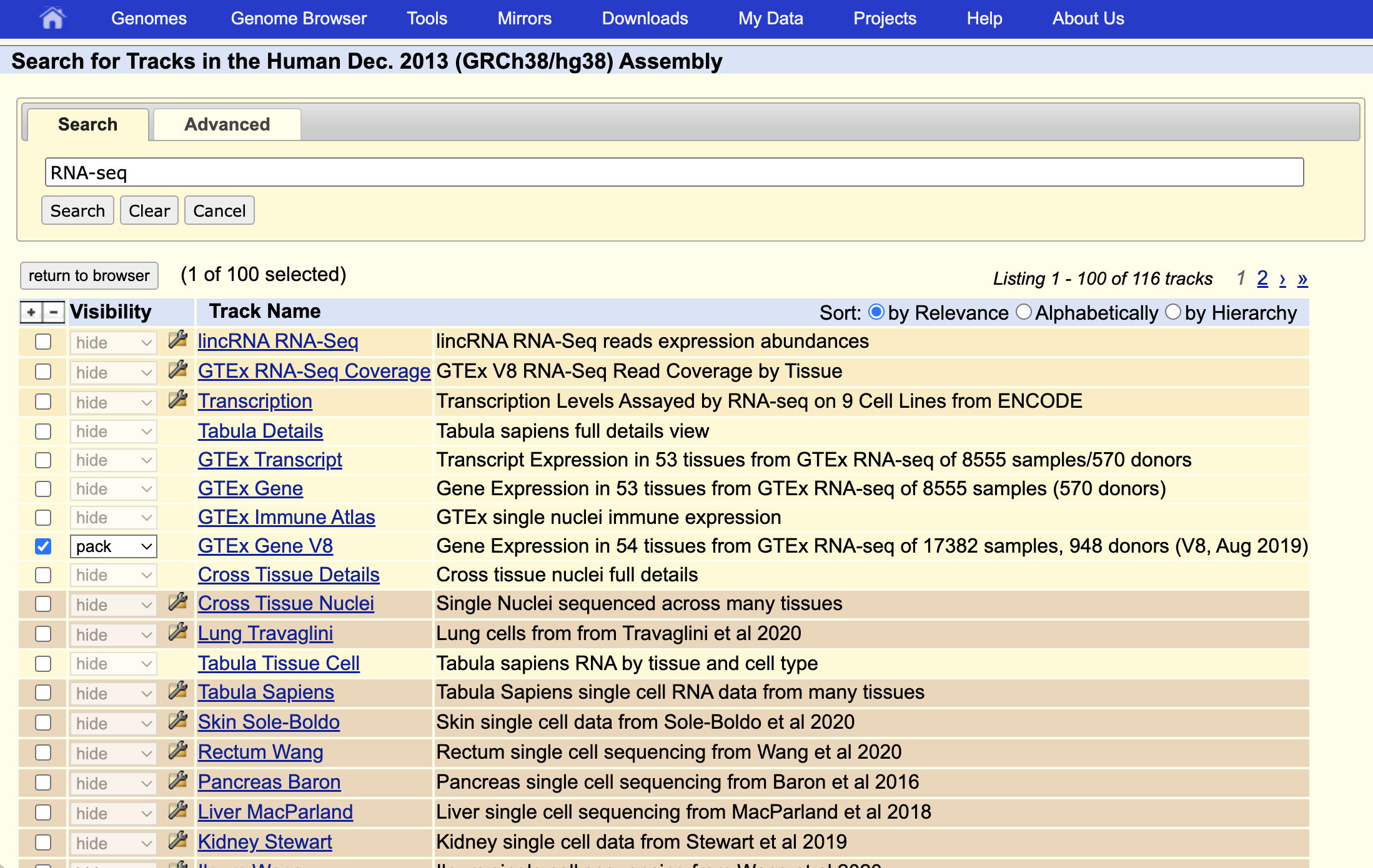 More information about can be found on the following help page. The Track Search feature can also be accessed by hovering over the "Genome Browser" drop-down menu.