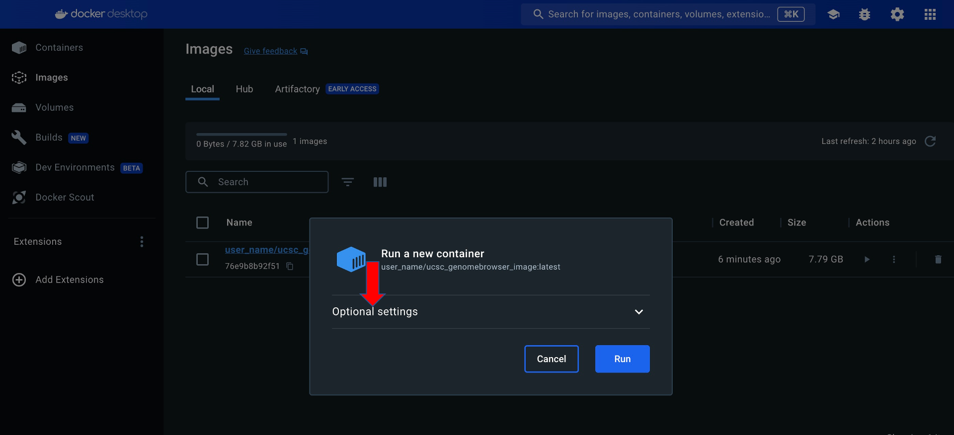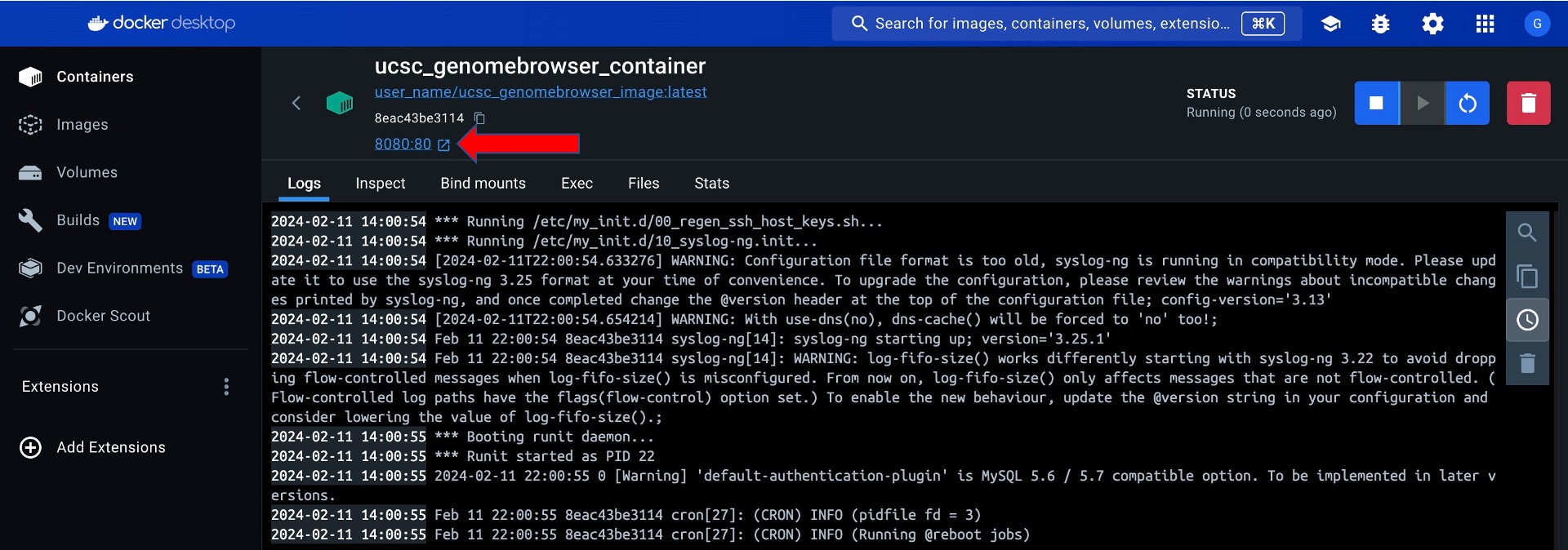 docker run -d --name ucsc_genomebrowser_container -p 8080:80 user_name/ucsc_genomebrowser_image