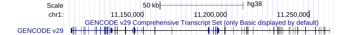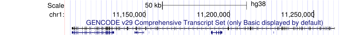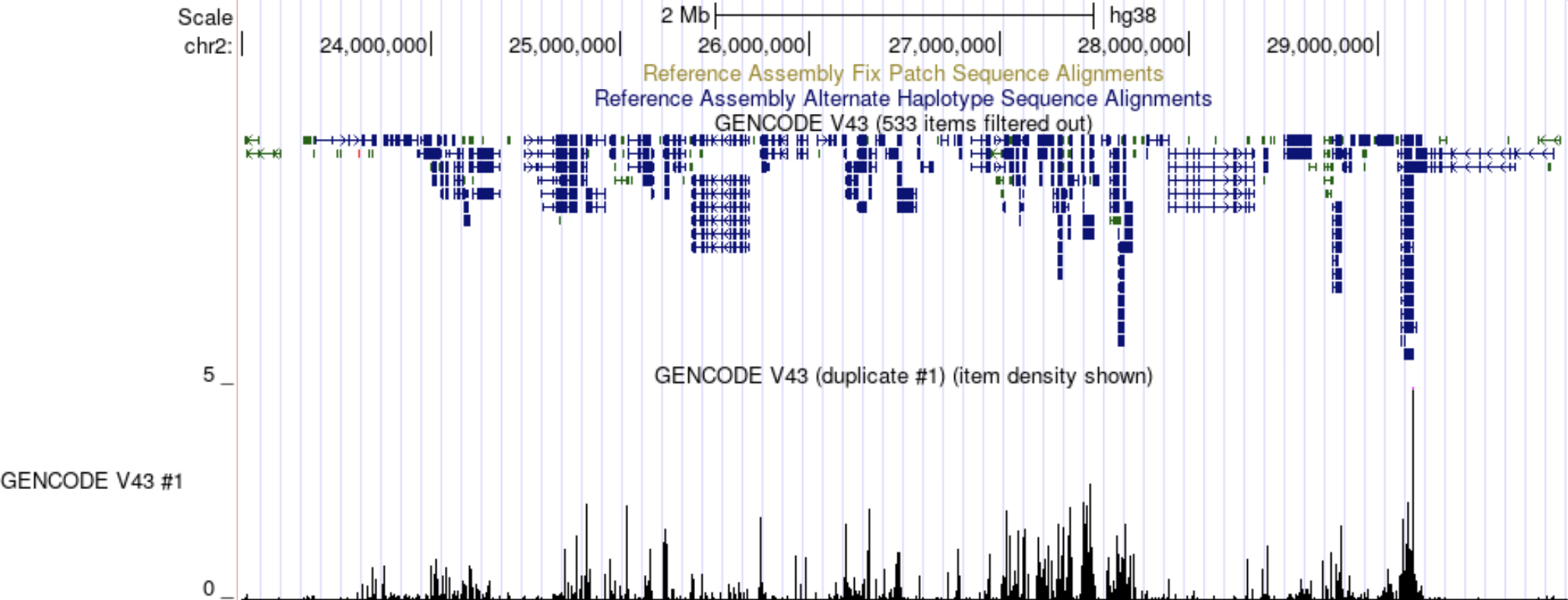 To remove intronic or intergenic regions from the display or to view only custom specified regions, click the multi-region button under the track image. For human assemblies hg17 and later, you may also replace a section of the reference genome with an alternate haplotype chromosome in order to view annotations upstream and downstream of the sequence. For more information about the multi-region feature see the multi-region help page.