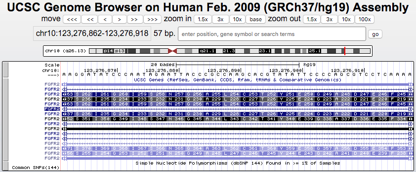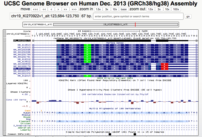 The above session helps illustrate the how same region in an exon can have different codon numbering reflecting different isoforms and that it is important to use caution when reading codon numbers in the literature. Here is an additional view of the region zoomed out 300x to display the alternate splicing.