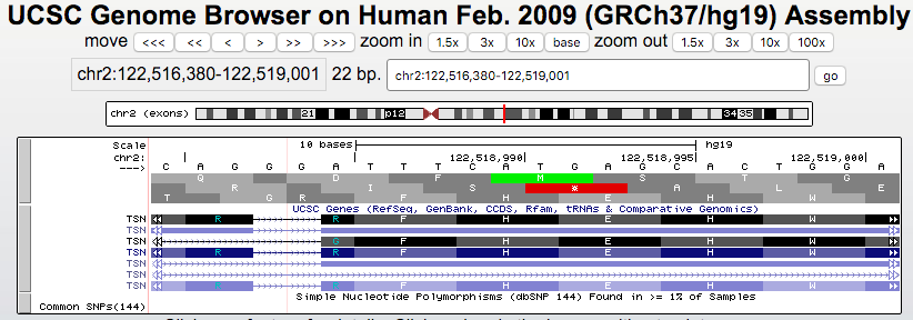 The above session helps illustrate the display of how one gene can have different transcripts with different start codons, displayed in green in the browser. Here is an example session displaying a start codon on the reverse strand. By clicking the "reverse" button below the browser one can flip the view.