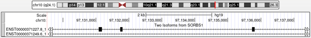 Top track is a custom track isolating two isoforms, ENST00000371227.8_1 and ENST00000371249.6_1 of the SORBS1 gene.