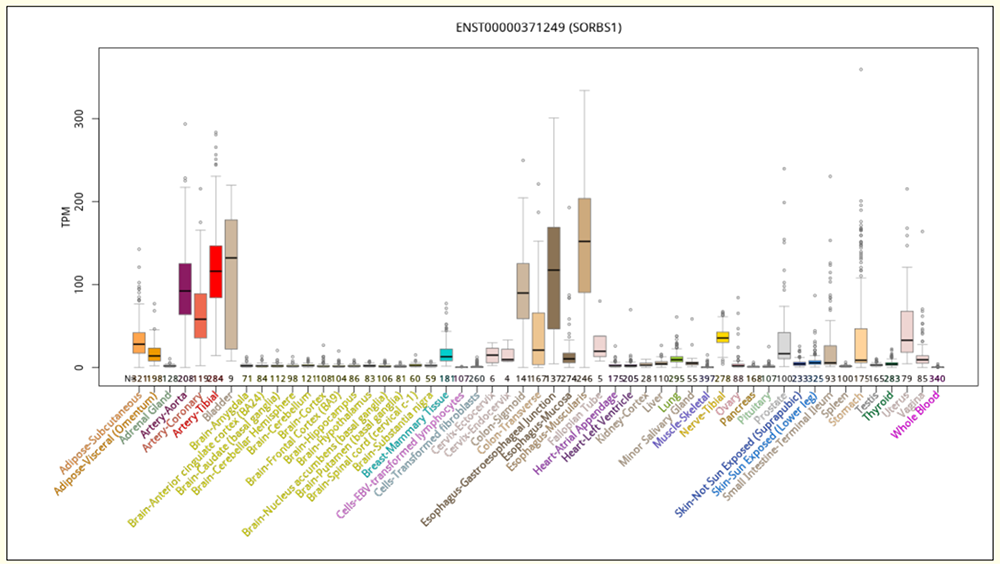 There are lots of differences between these two transcript's levels of gene expression in varying tissue types; ENST227 has high frequencies of expression in muscle-skeletal and heart cells (two types), while ENST249 has high expression frequencies in colon, esophagus, bladder, artery, and fallopian tube cells. Insulin demands may be very different from tissue to tissue, and the genome allows for different isoforms of SORBS1 to be produced in order to address the needs of individual cell types. The data provided in the GTEx tracks are the raw material for scientists seeking to understand how gene expression differs in different cell and tissue types.