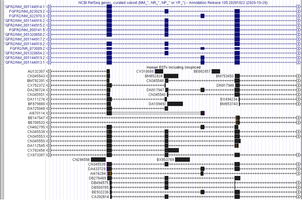 The "Spliced ESTsi" track allows us to analyze sequences of FGFR2 gene with different exon arrangements.