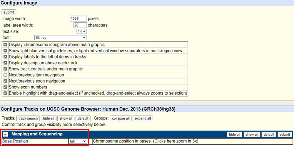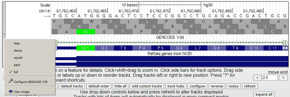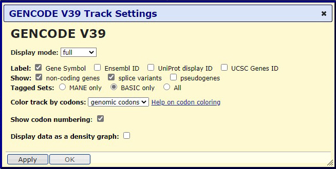 Figure 3b "GENCODE" track configuration settings. Here, click the "Show codon numbering" checkbox to show the numbering for the codons.